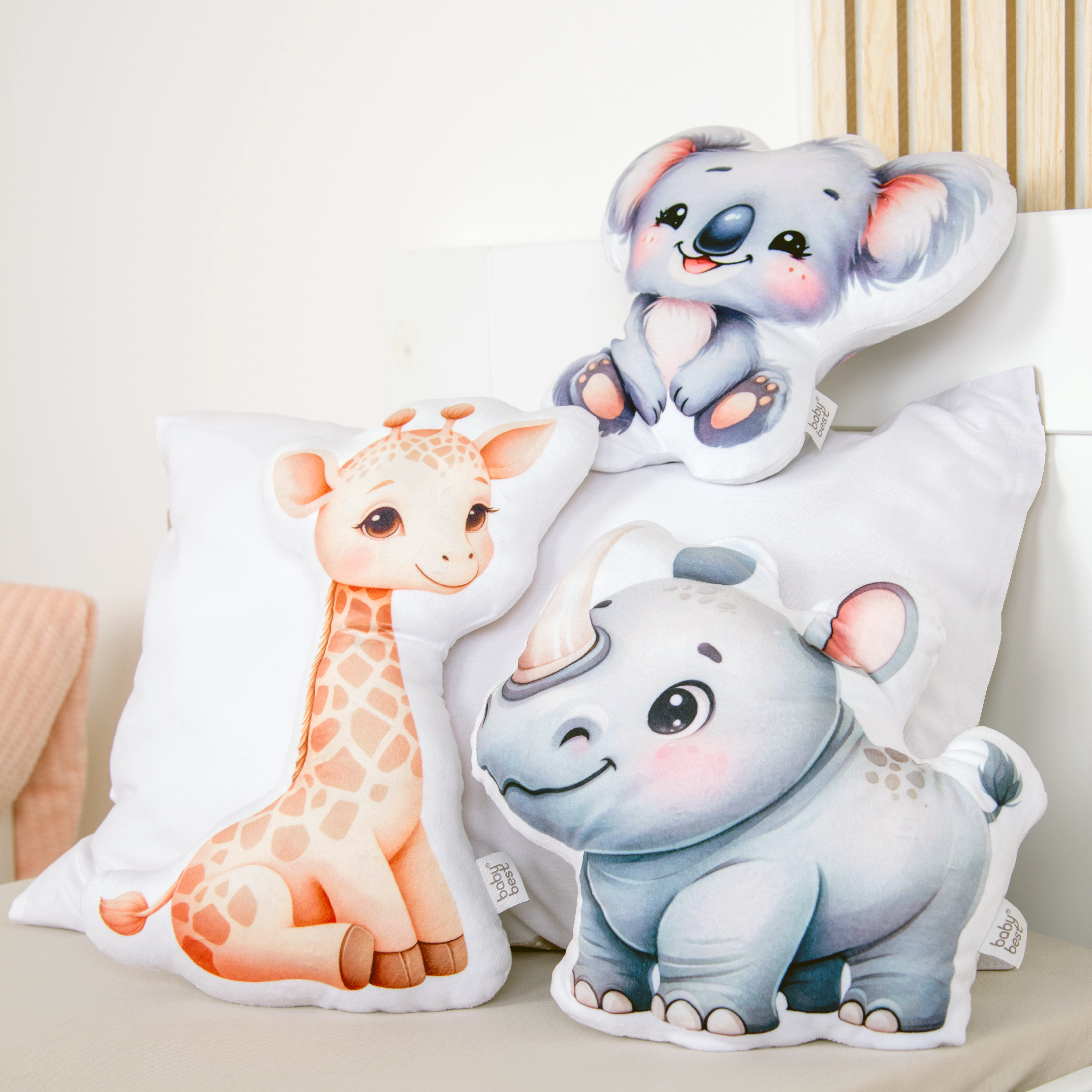 Dieses Kissen-Set mit den „Adventure Buddies“ – Nashorn, Koala und Giraffe – lädt zum Knuddeln, Spielen und Träumen ein.