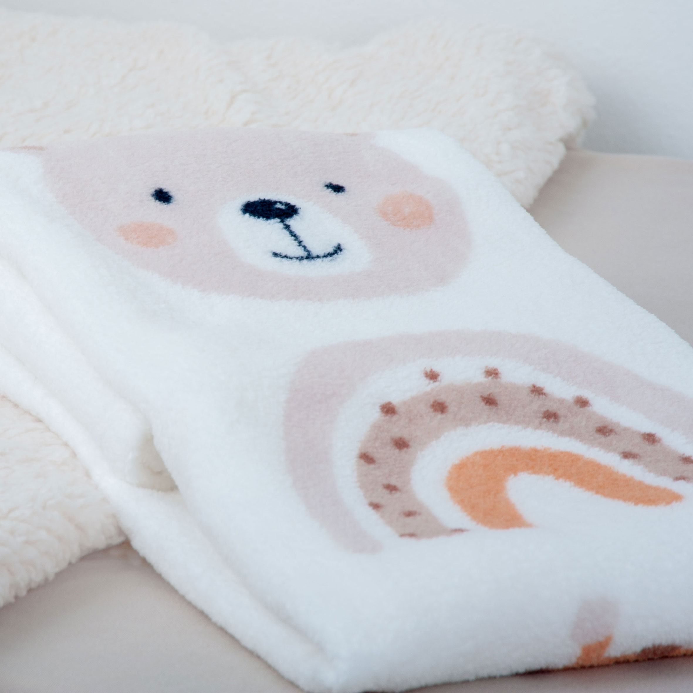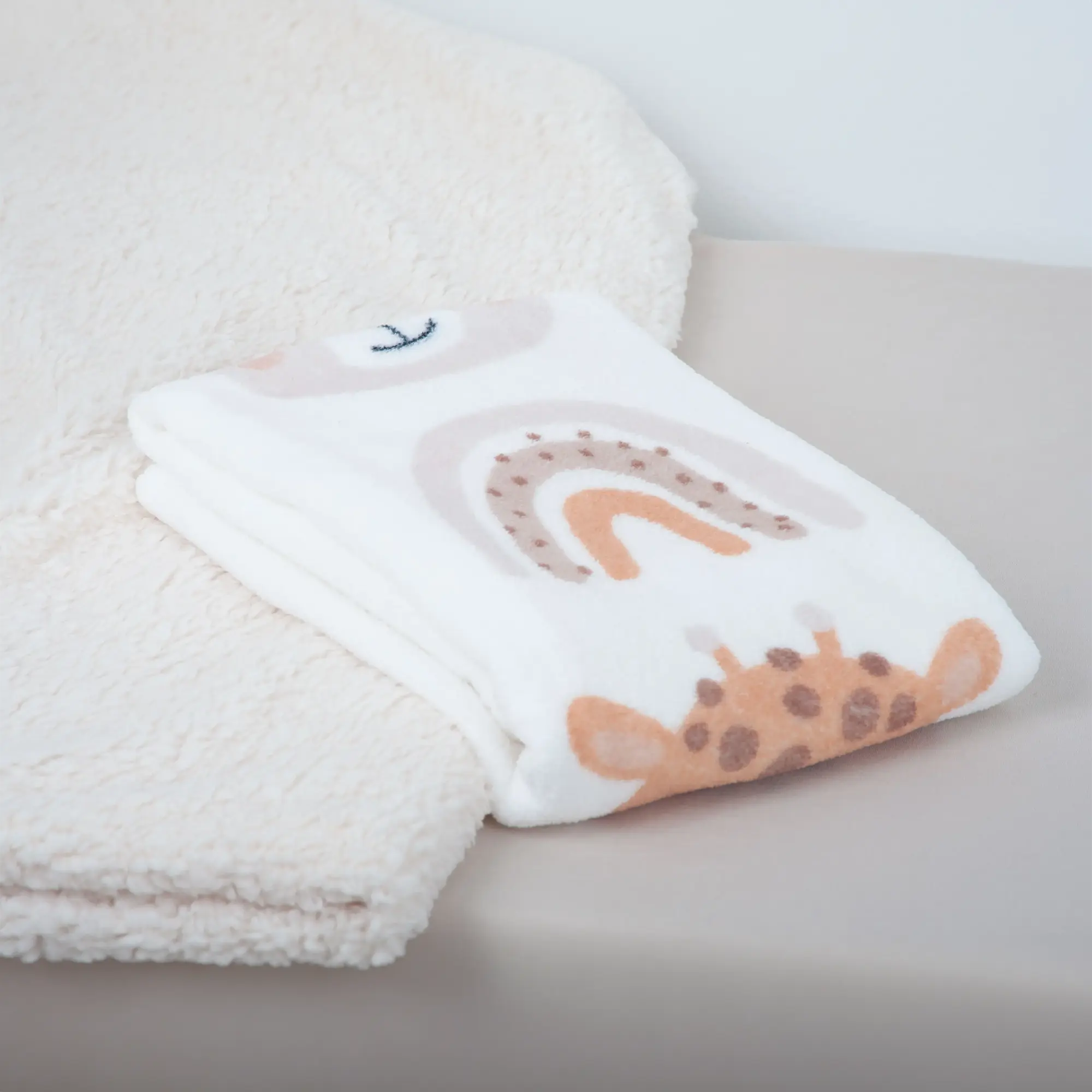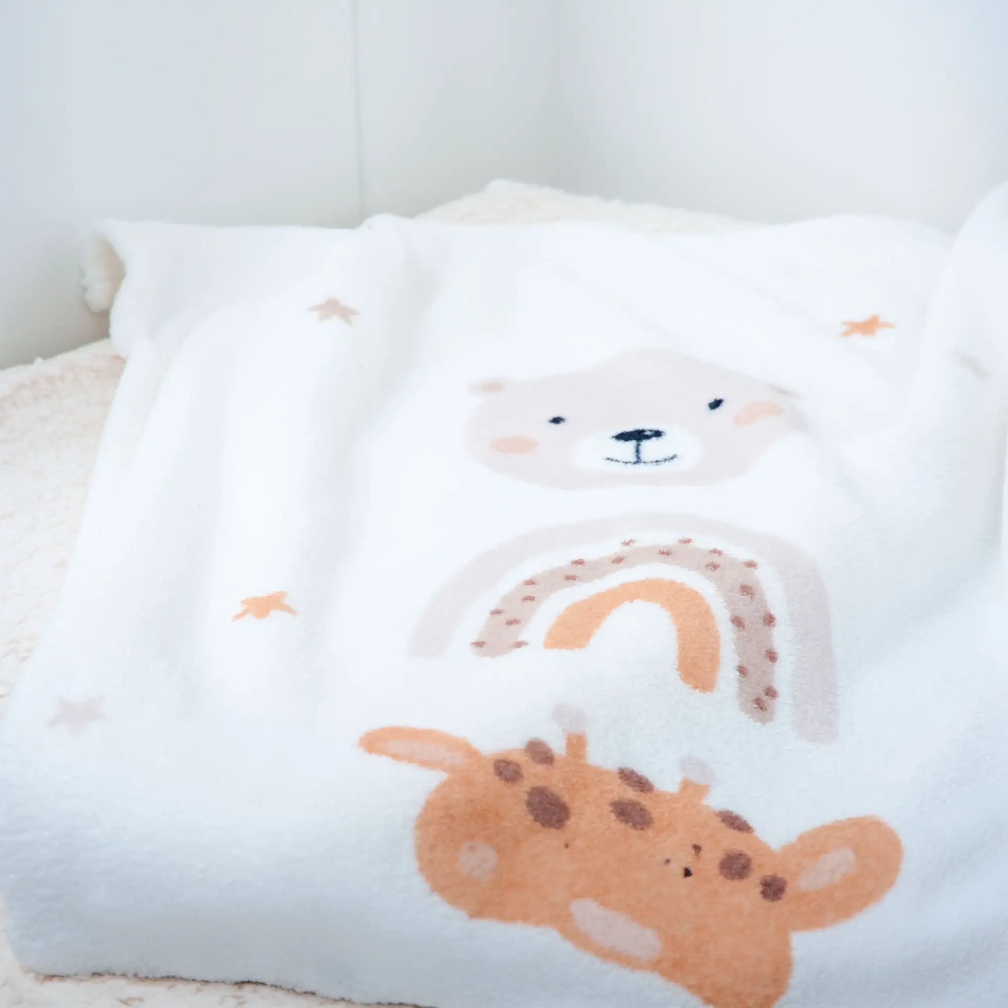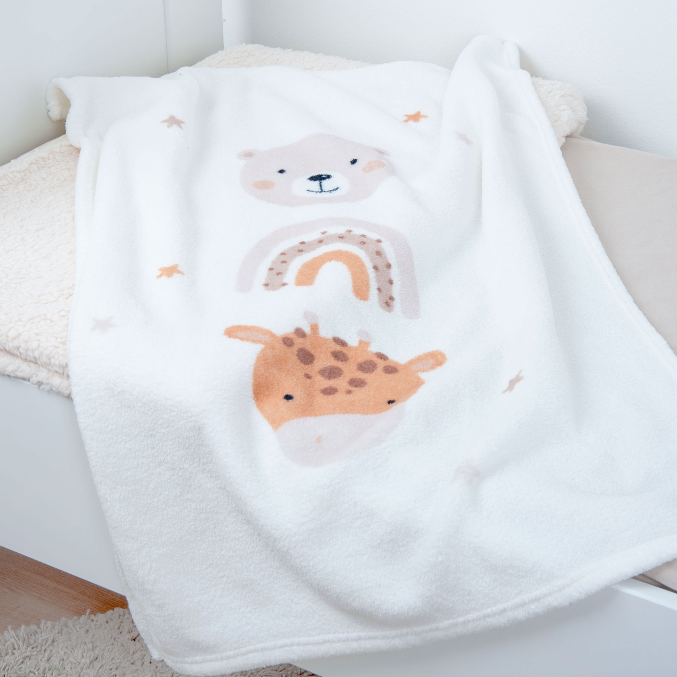 Diese Kuscheldecke mit liebevollen Tiermotiven begleitet Babys beim Spielen, Schlafen und Kuscheln.