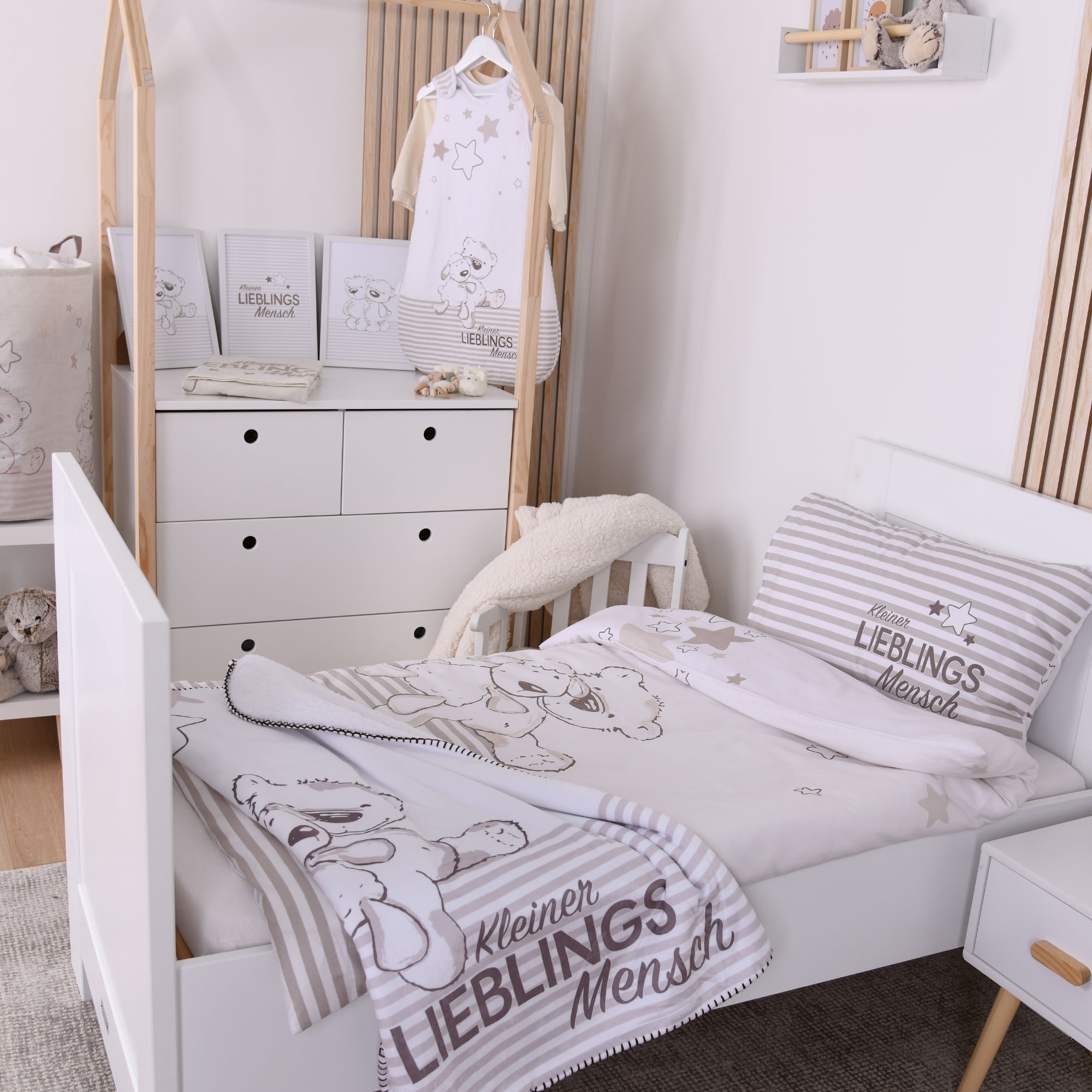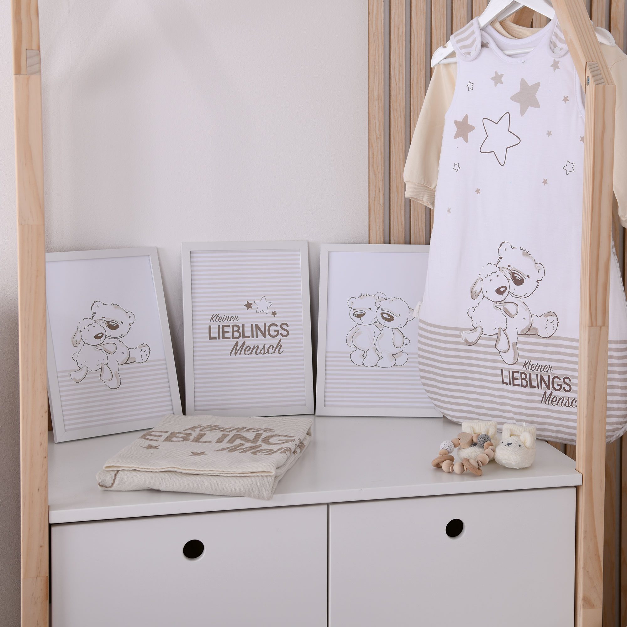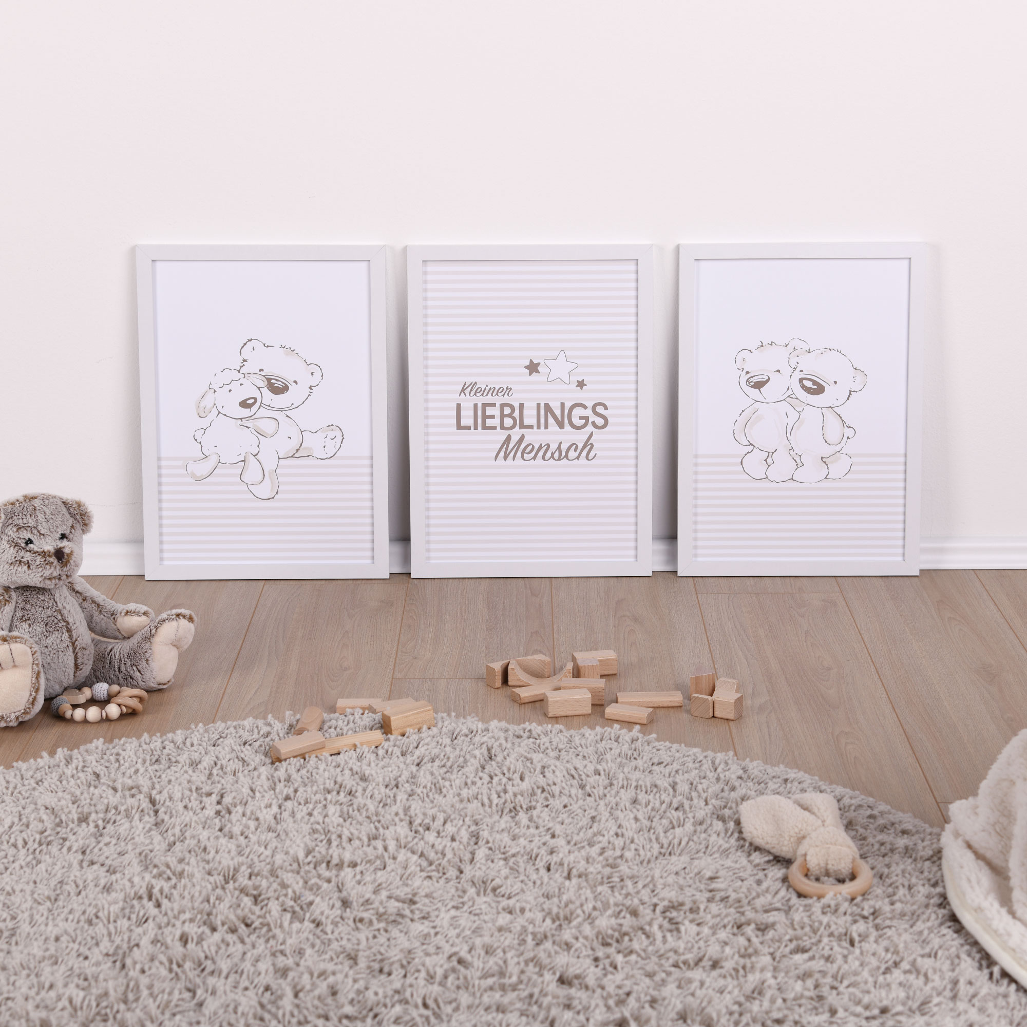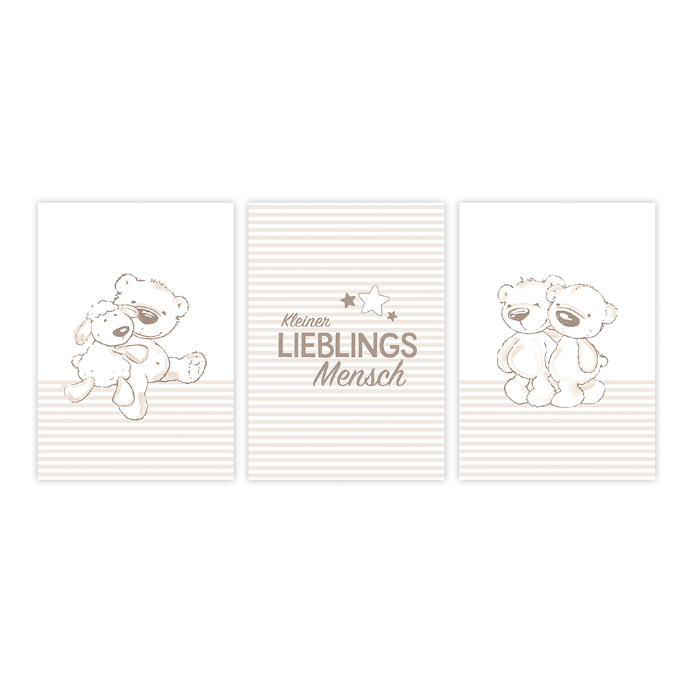 Das Kleiner Lieblingsmensch 3er-Set bringt Wärme und Liebe ins Kinderzimmer. In sanften Beigetönen mit Bärchen und Schriftzug „Kleiner Lieblingsmensch“ entstehen drei Motive, die zusammen eine wundervolle Einheit bilden.