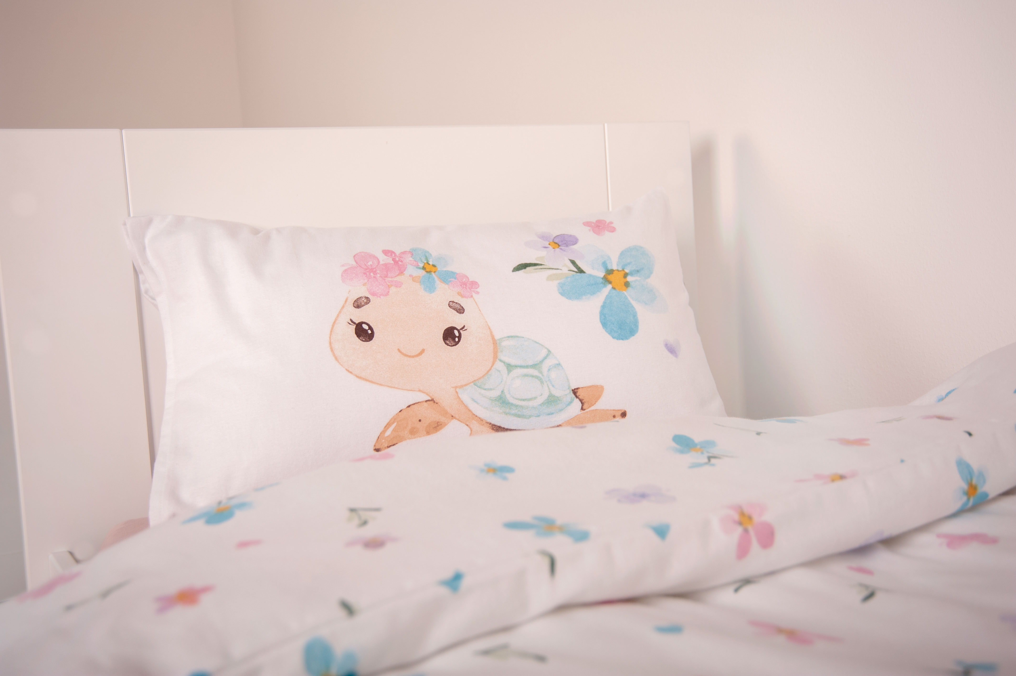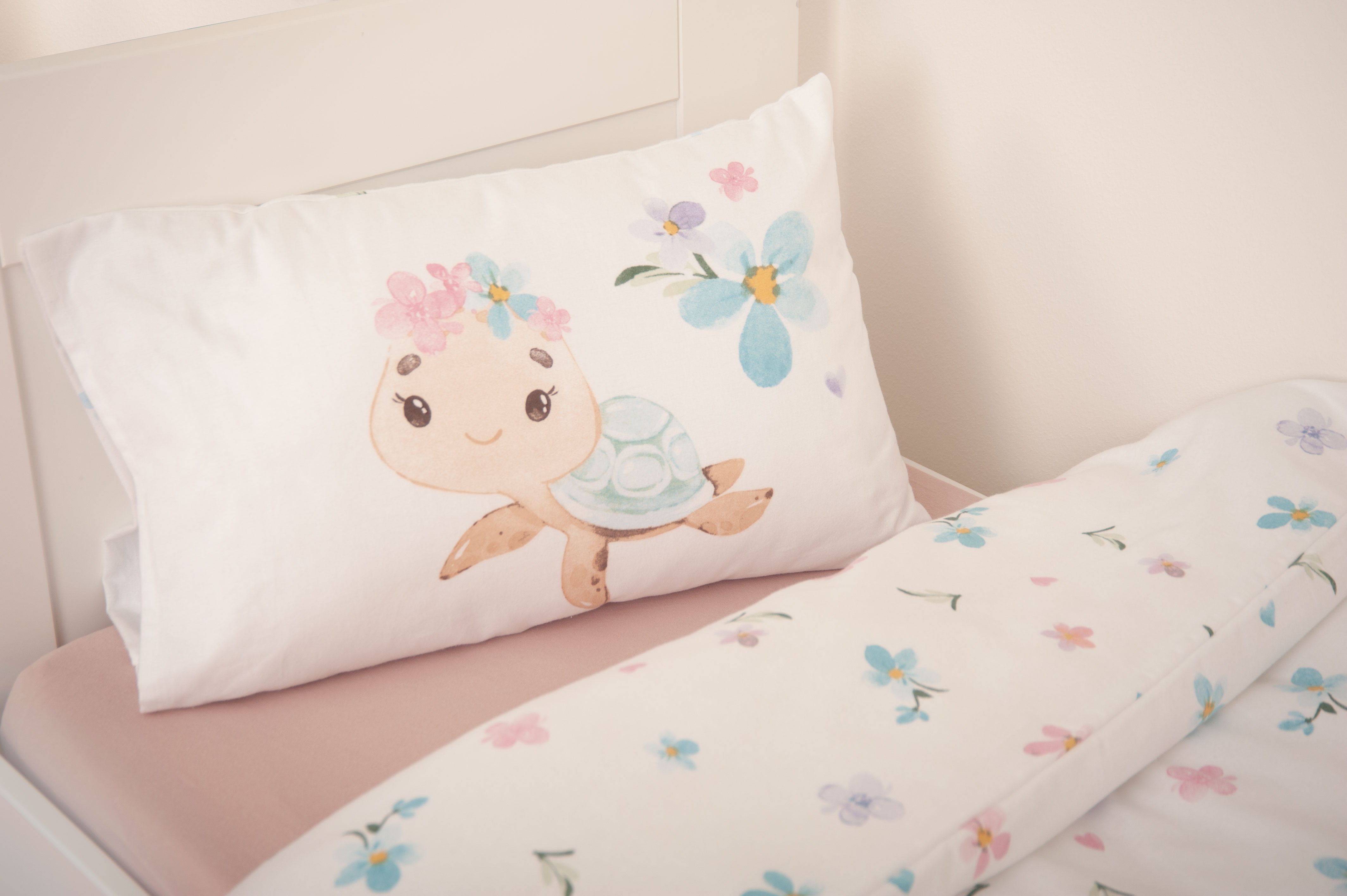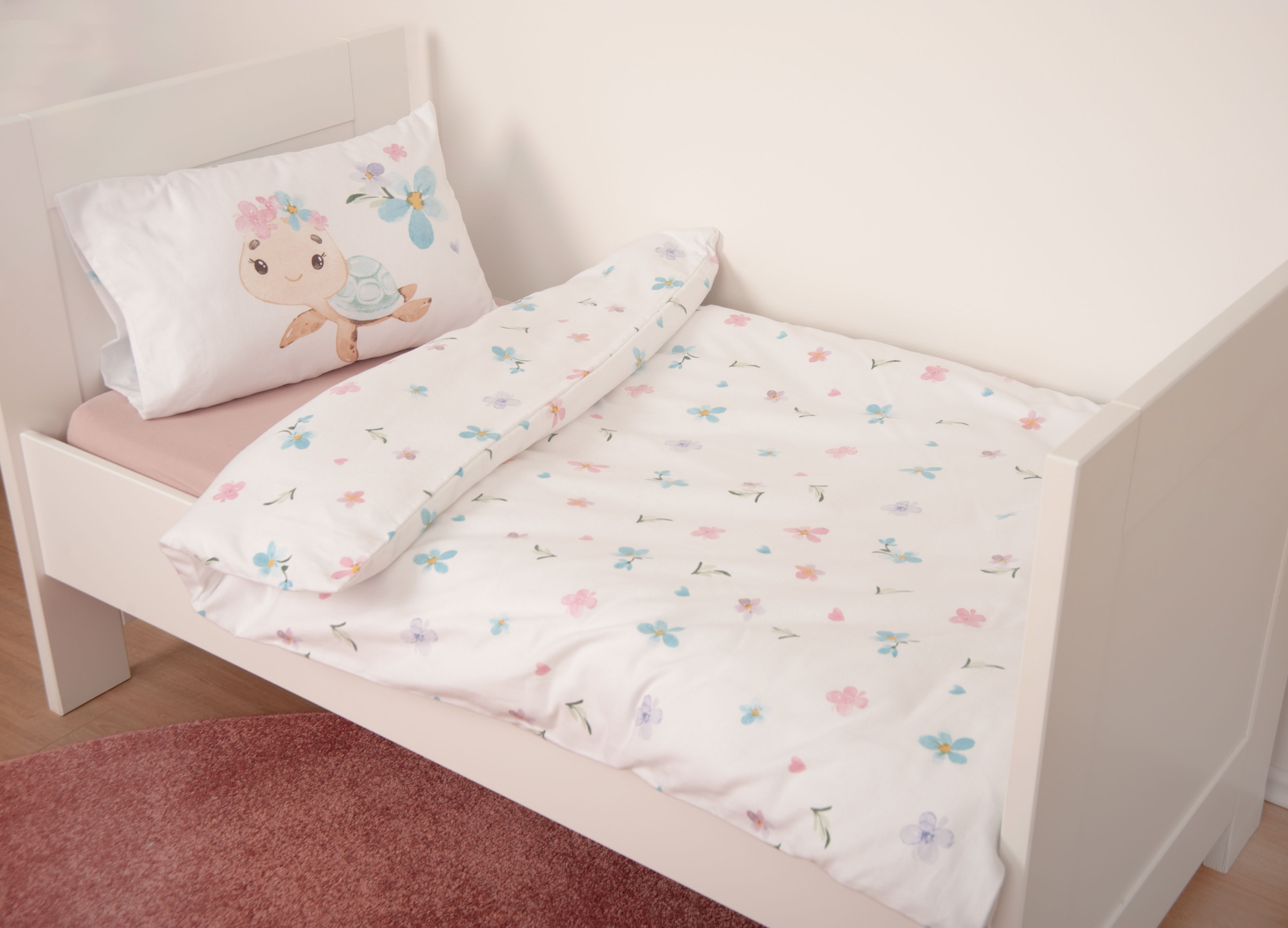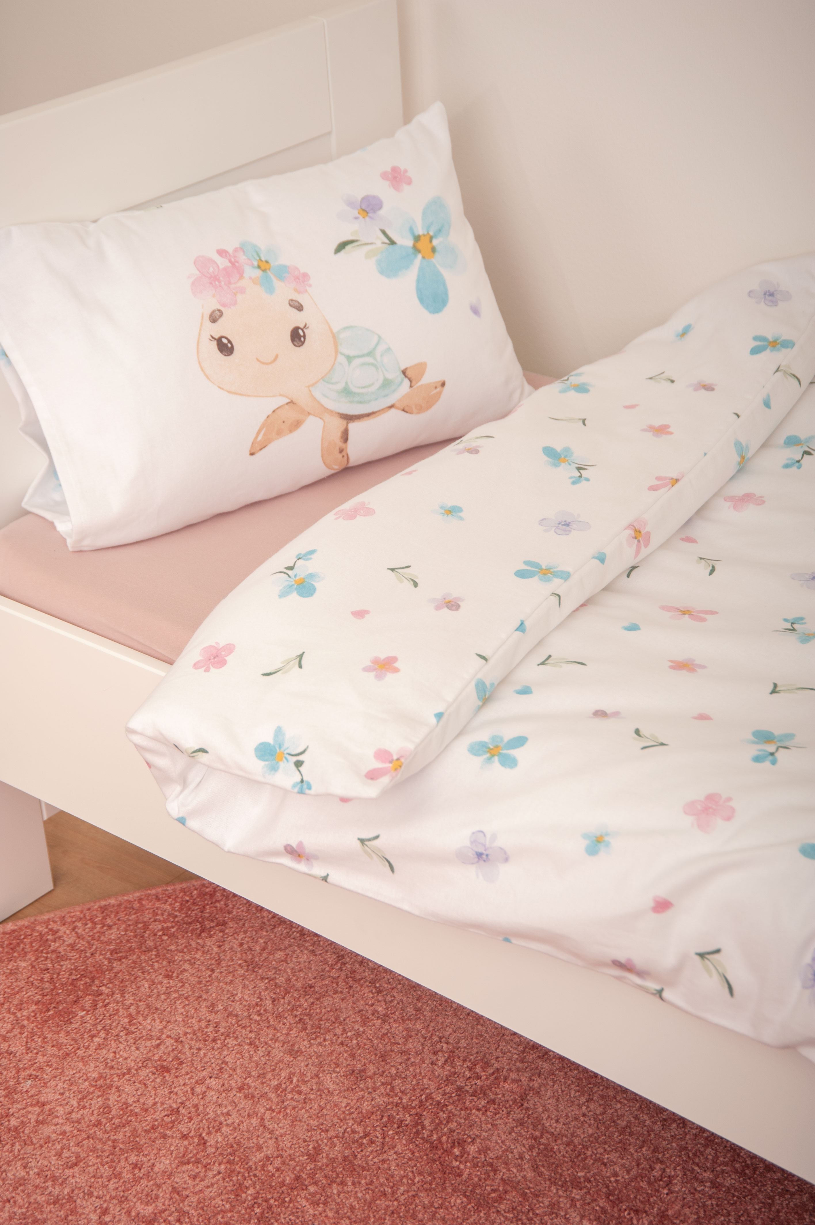 Entdecke unsere kuschelige babybest® Winterbettwäsche – Little Turtle aus 100% Baumwolle/Flanell, die nicht nur ultimativen Komfort bietet, sondern auch mit einem bezaubernden Blumenmuster und einer niedlichen Schildkröte verziert ist. Unsere Flanell-Bettwäsche ist besonders weich und warm, ideal für kalte Nächte. Das verspielte Blumenmuster und die Schildkröte verwandeln das Kinderbett in einen zauberhaften Garten der Träume und lässt Kinderaugen strahlen.