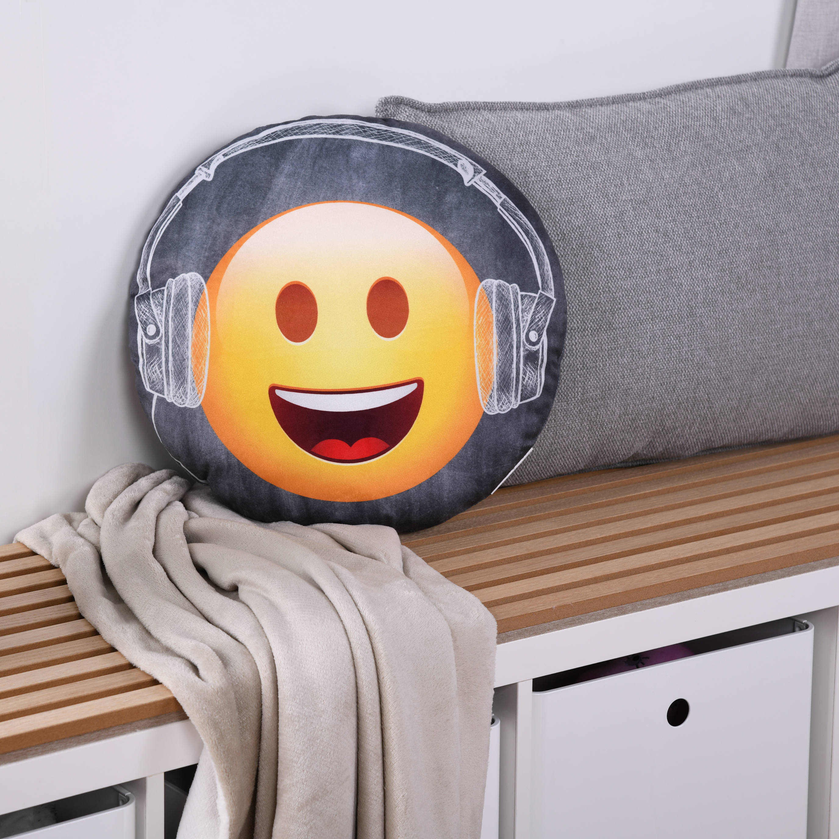 Dieses runde Kissen mit coolem Emoticon-Motiv und Kopfhörern bringt gute Laune auf Sofa, Bett oder Sessel. Perfekt zum Relaxen, Dekorieren oder Verschenken an Musikliebhaber.