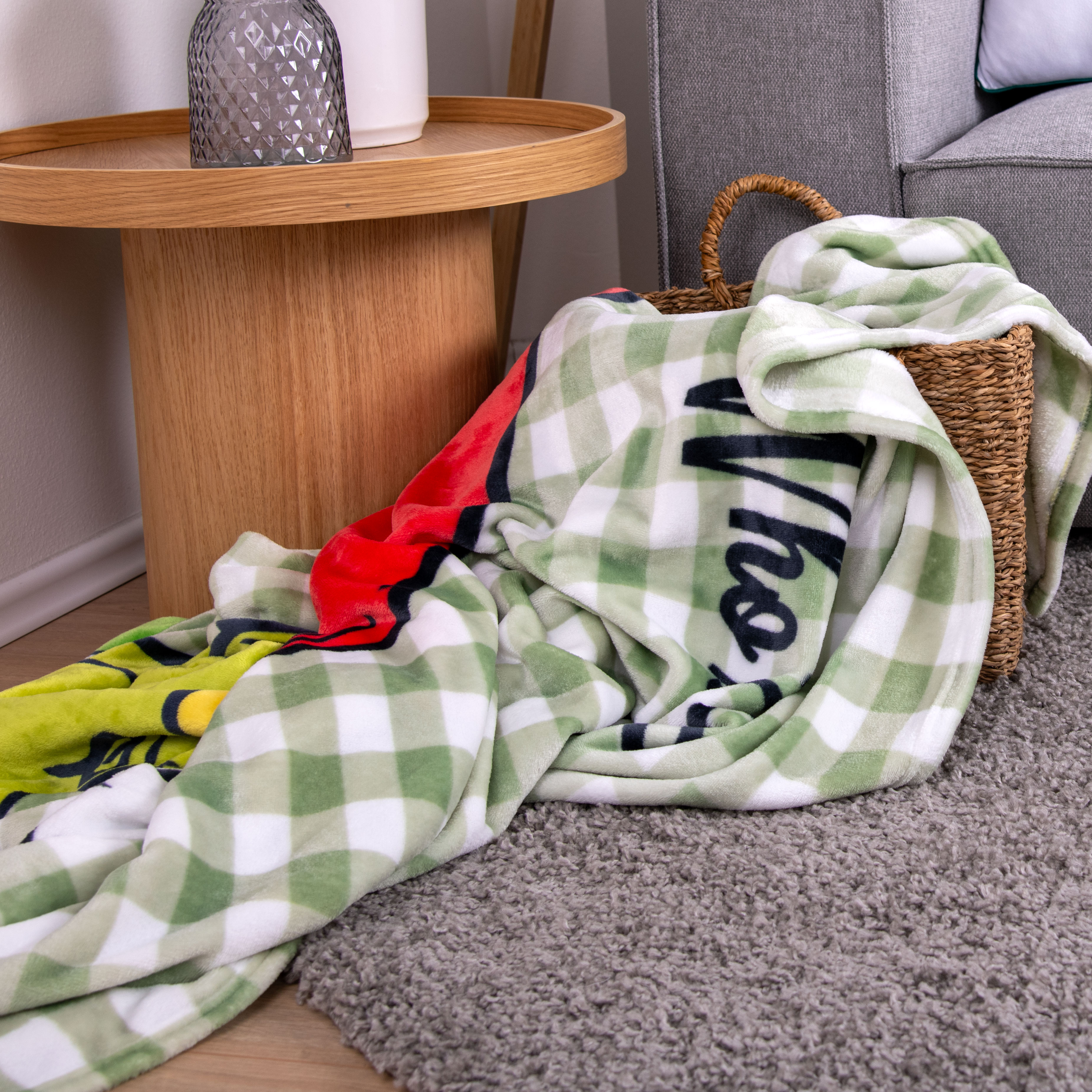 Diese Decke mit frechem Grinch-Motiv bringt schelmische Weihnachtsstimmung aufs Sofa. Perfekt zum Einmummeln, Lachen und Verschenken an alle, die Weihnachten mit Augenzwinkern feiern!