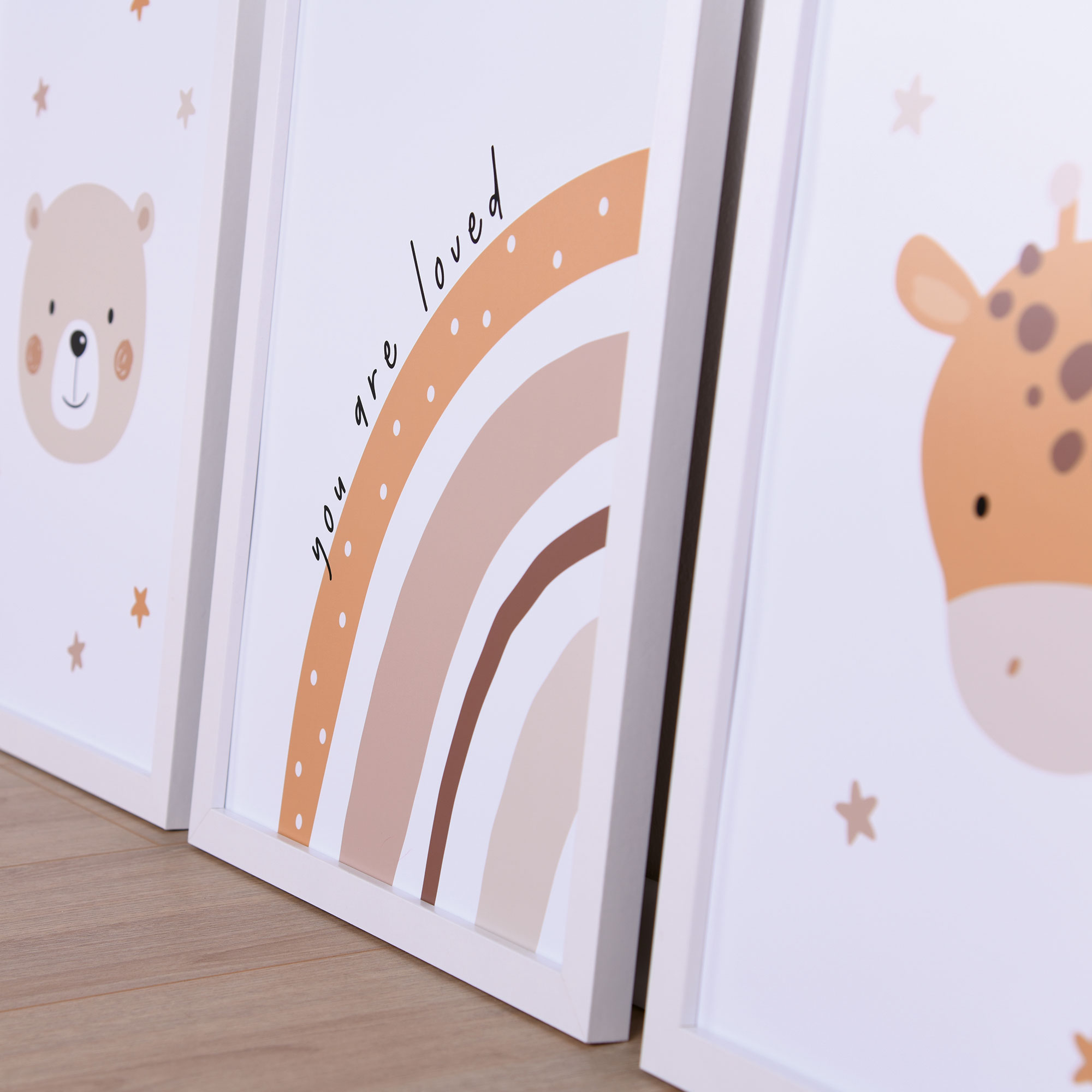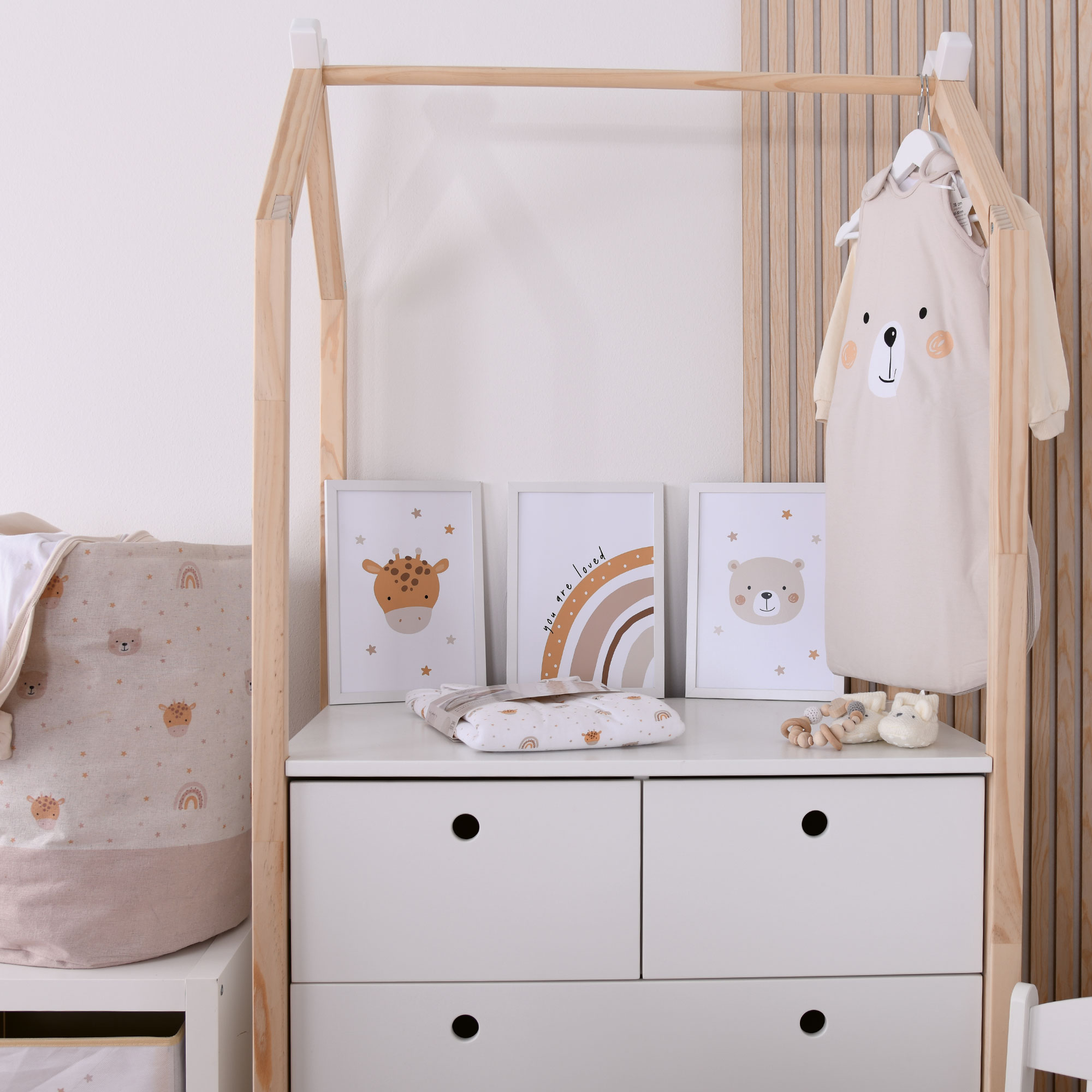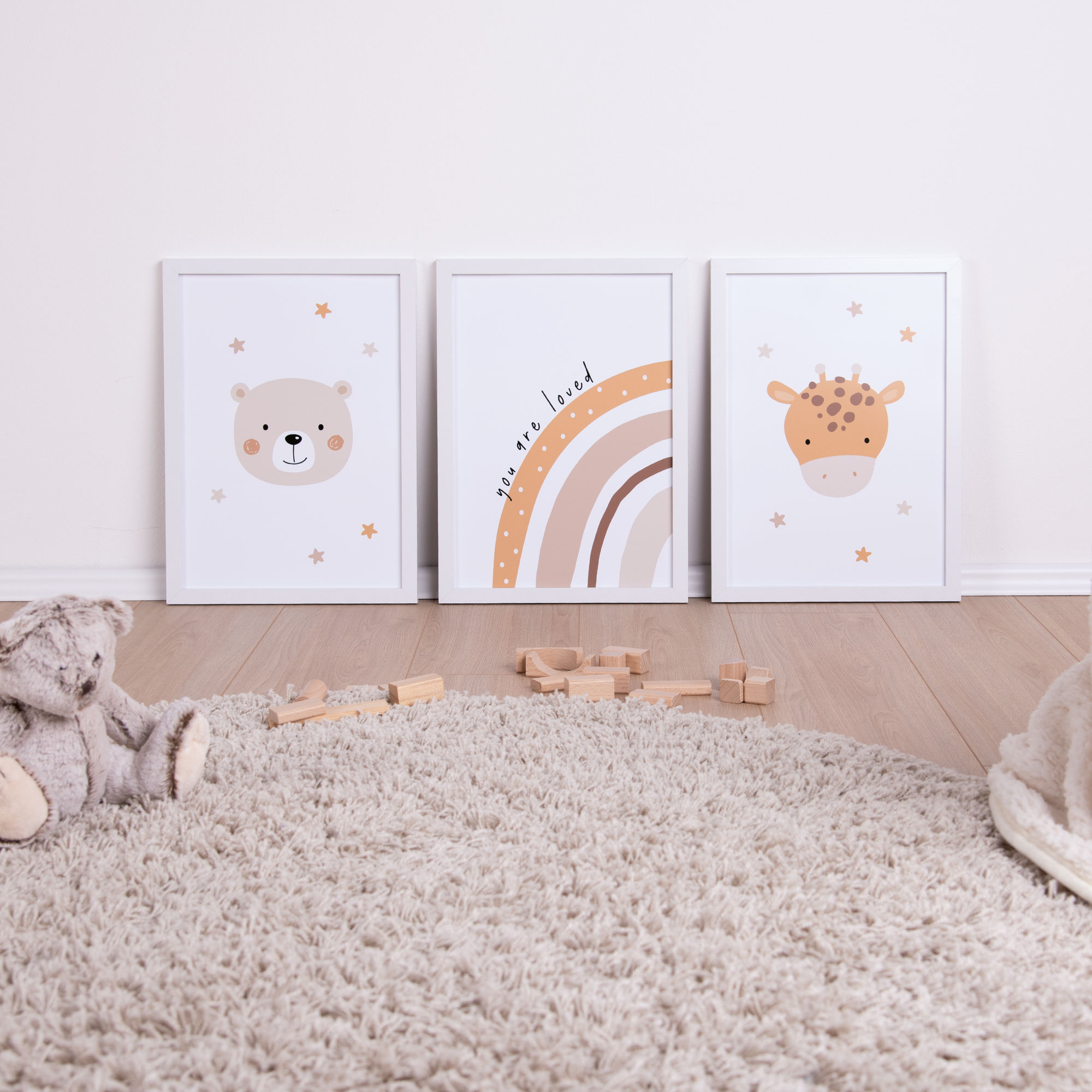 Drei liebevoll illustrierte Baby-Prints in DIN A4 oder A3 mit freundlich-verspielten Tiermotiven (z. B. Bär, Giraffe, Regenbogen). Schaffen sofort Gemütlichkeit an den Wänden und regen die Fantasie an. -