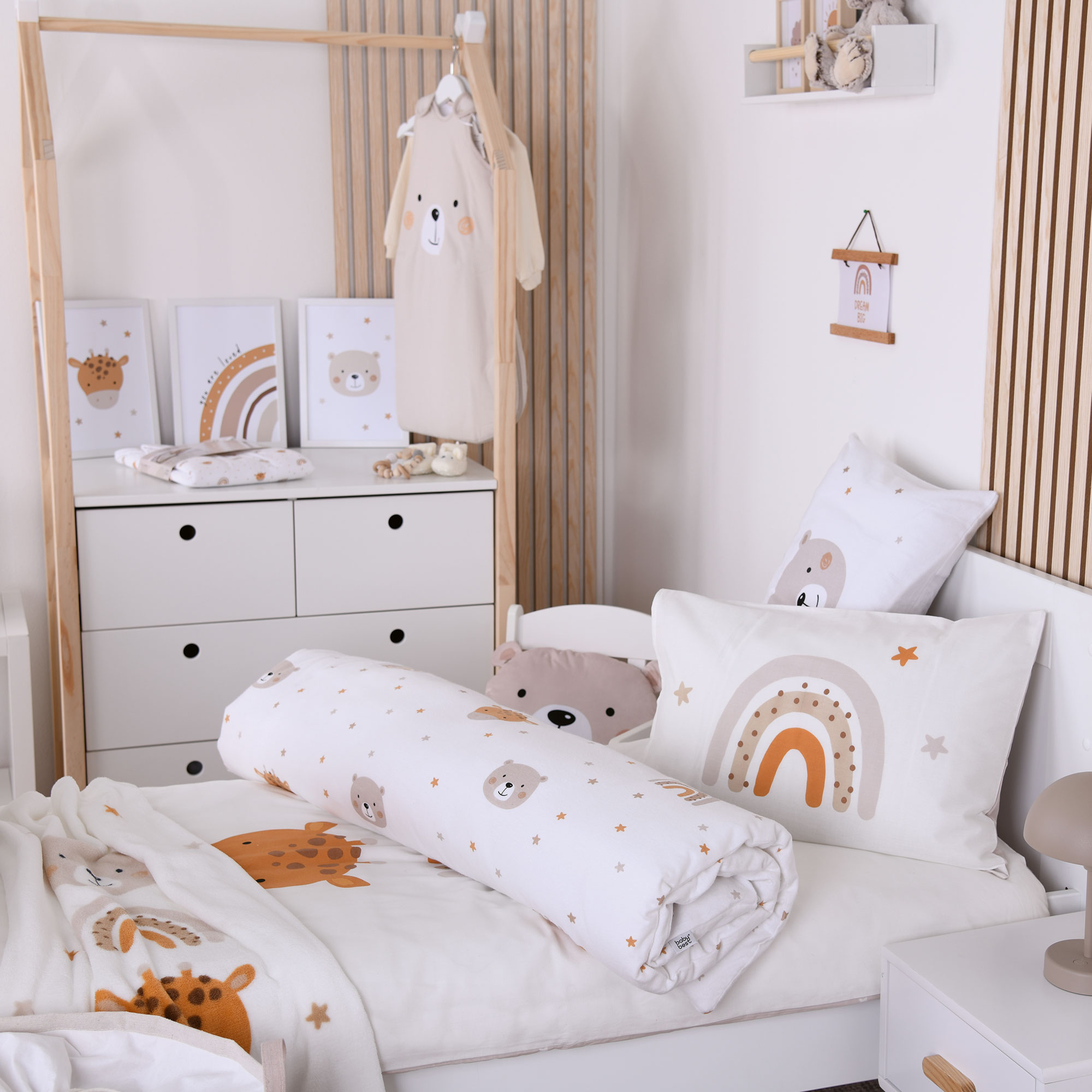 Ein liebevoll gestaltetes Komplett-Set im Little-Friends-Look: Schlafsack, Kuscheldecke, Wandbilder und Aufbewahrungsbox. Perfekt fürs Babyzimmer, harmonisch, praktisch und voller Charme.