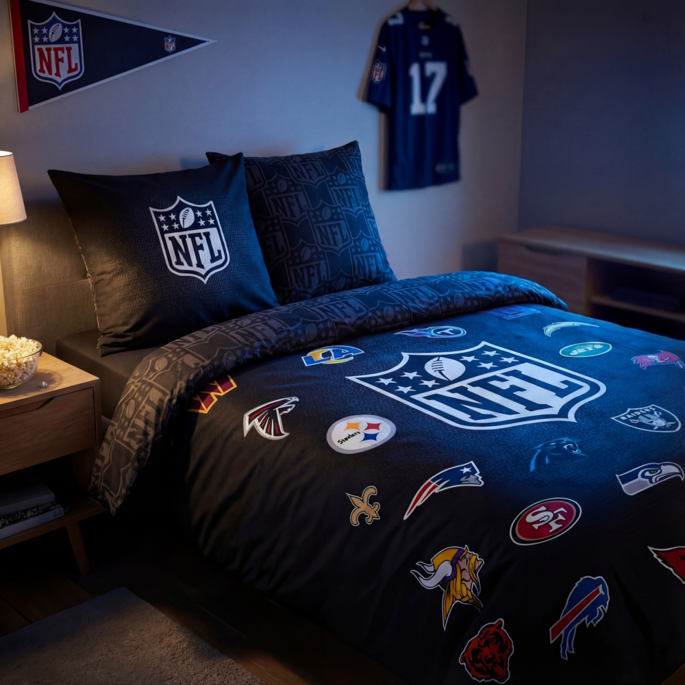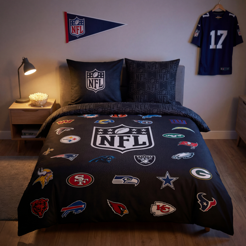 Diese coole Bettwäsche mit den Logos aller NFL-Teams bringt echtes Football-Feeling ins Schlafzimmer – perfekt für jeden Fan.