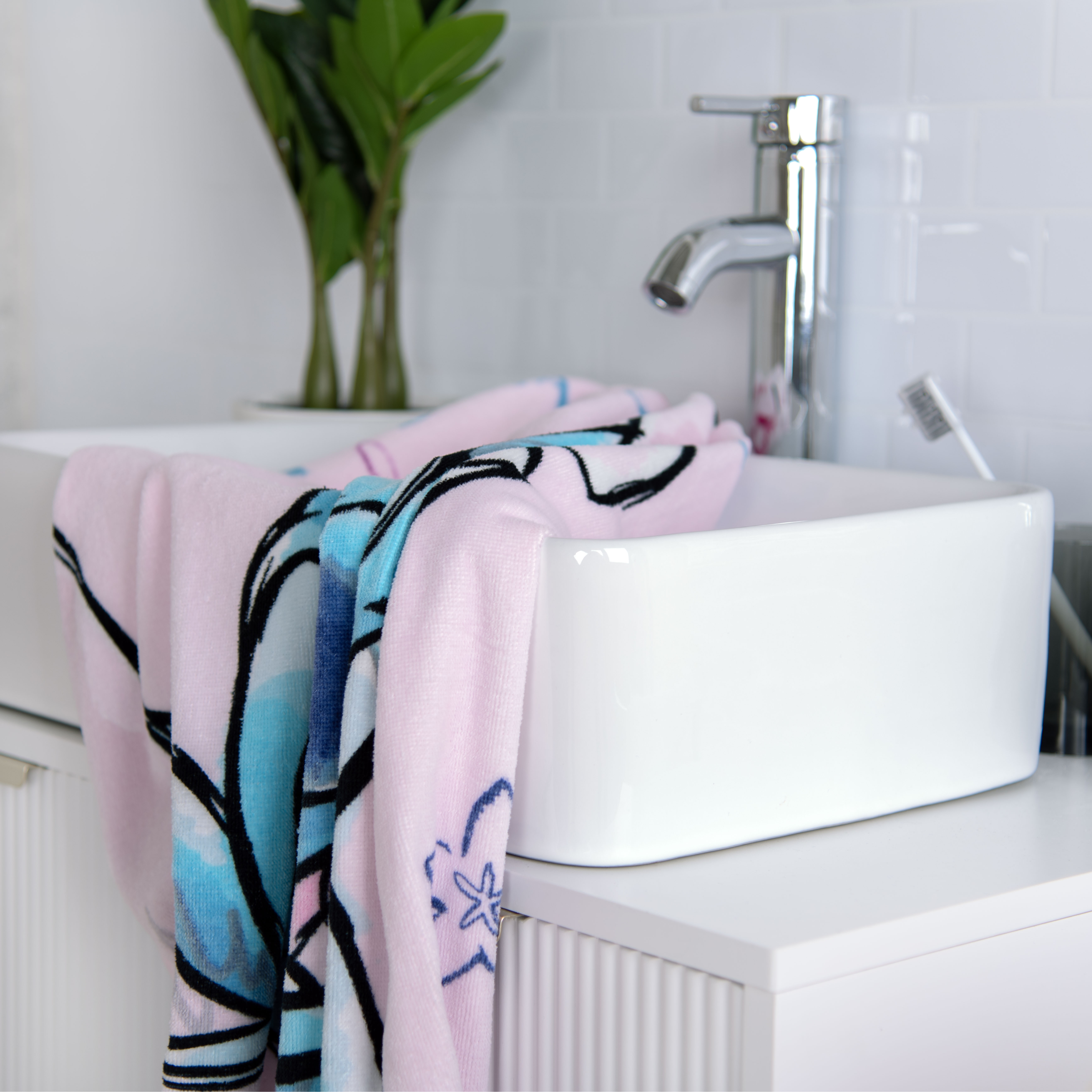 Mit dem Stitch Badetuch – Stitch wird jeder Badeausflug zum intergalaktischen Abenteuer! Das süße Motiv der beiden außerirdischen Freunde sorgt für jede Menge Spaß am Strand, im Schwimmbad oder im Badezimmer.