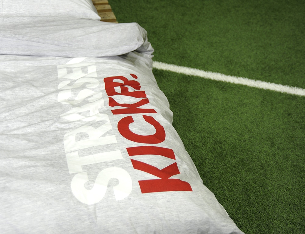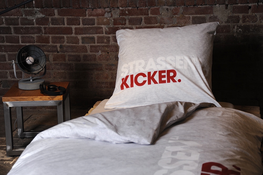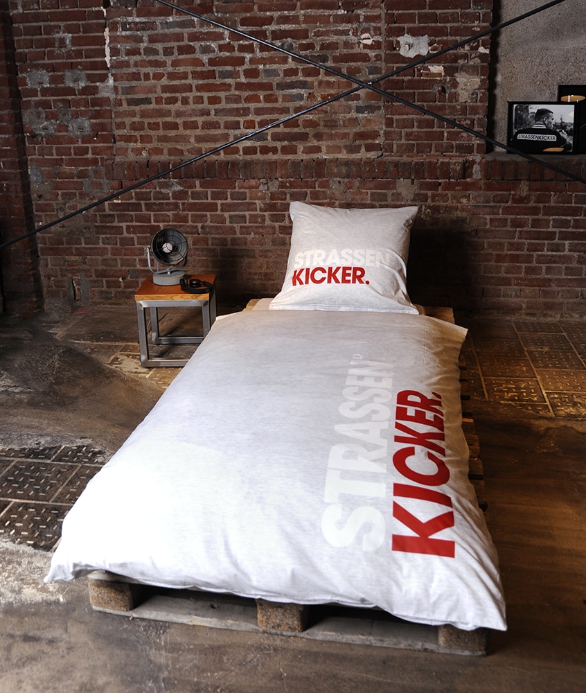 Diese Bettwäsche bringt urbanen Style ins Schlafzimmer. Mit dem markanten STRASSENKICKER-Logo ist sie ein echtes Statement für Fußballfans.