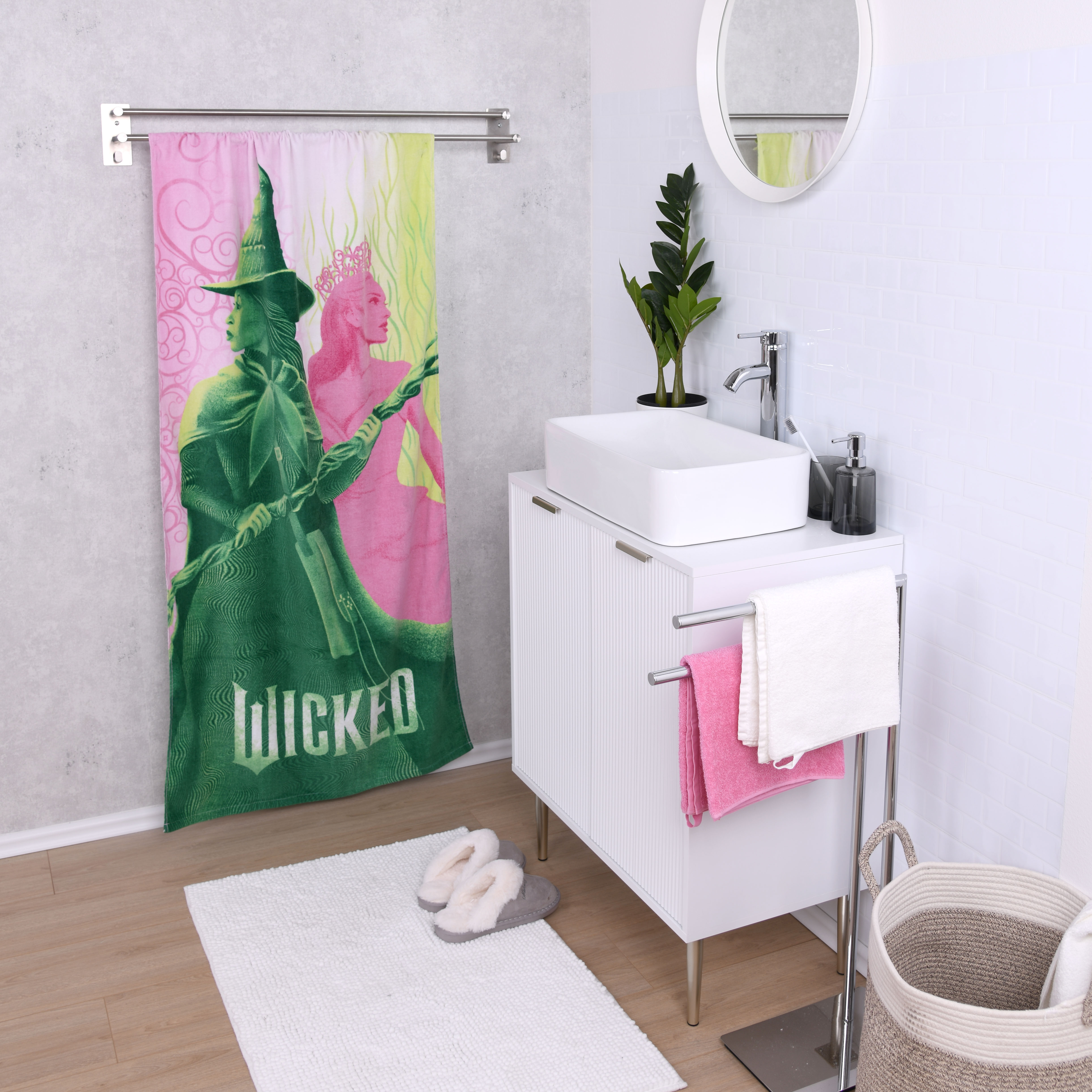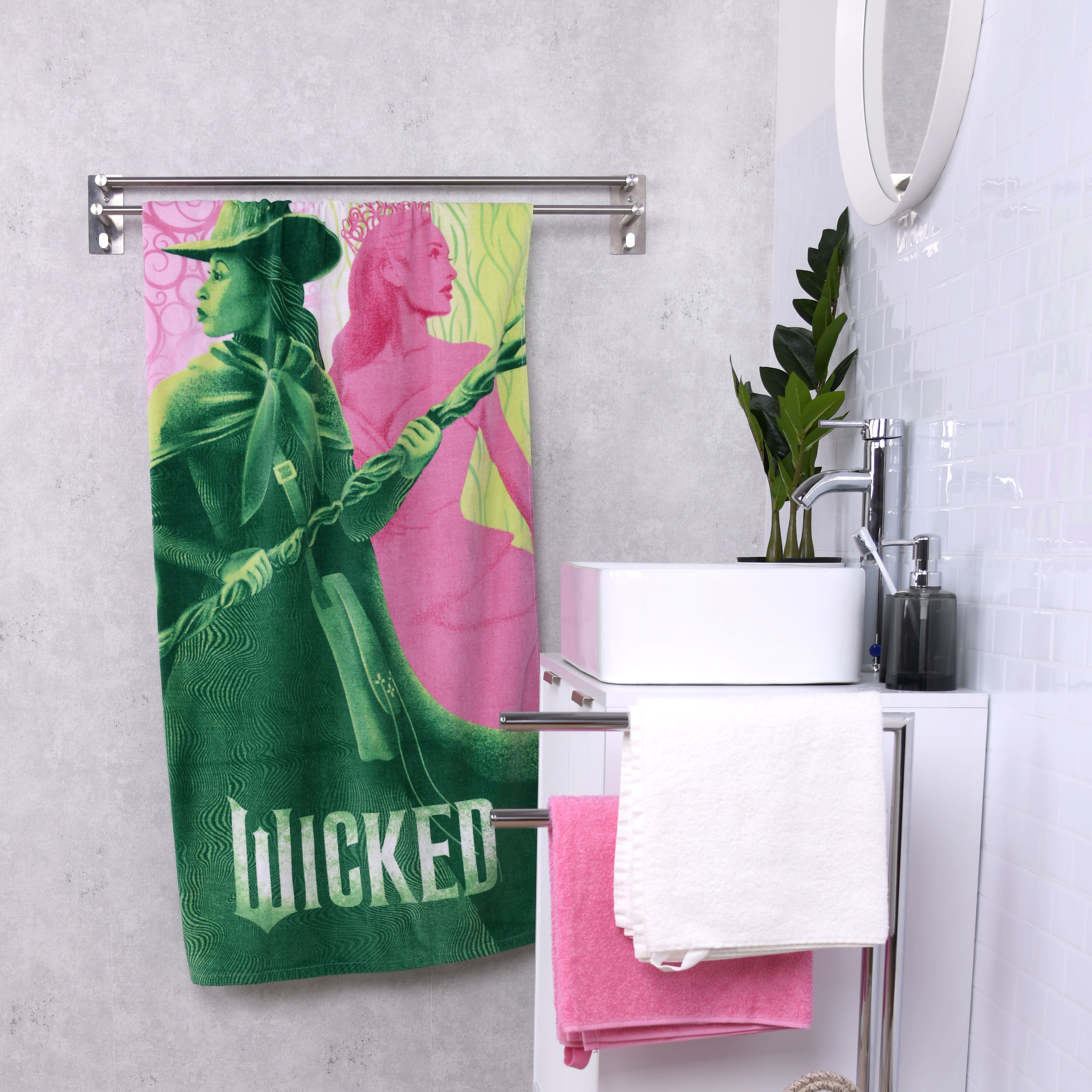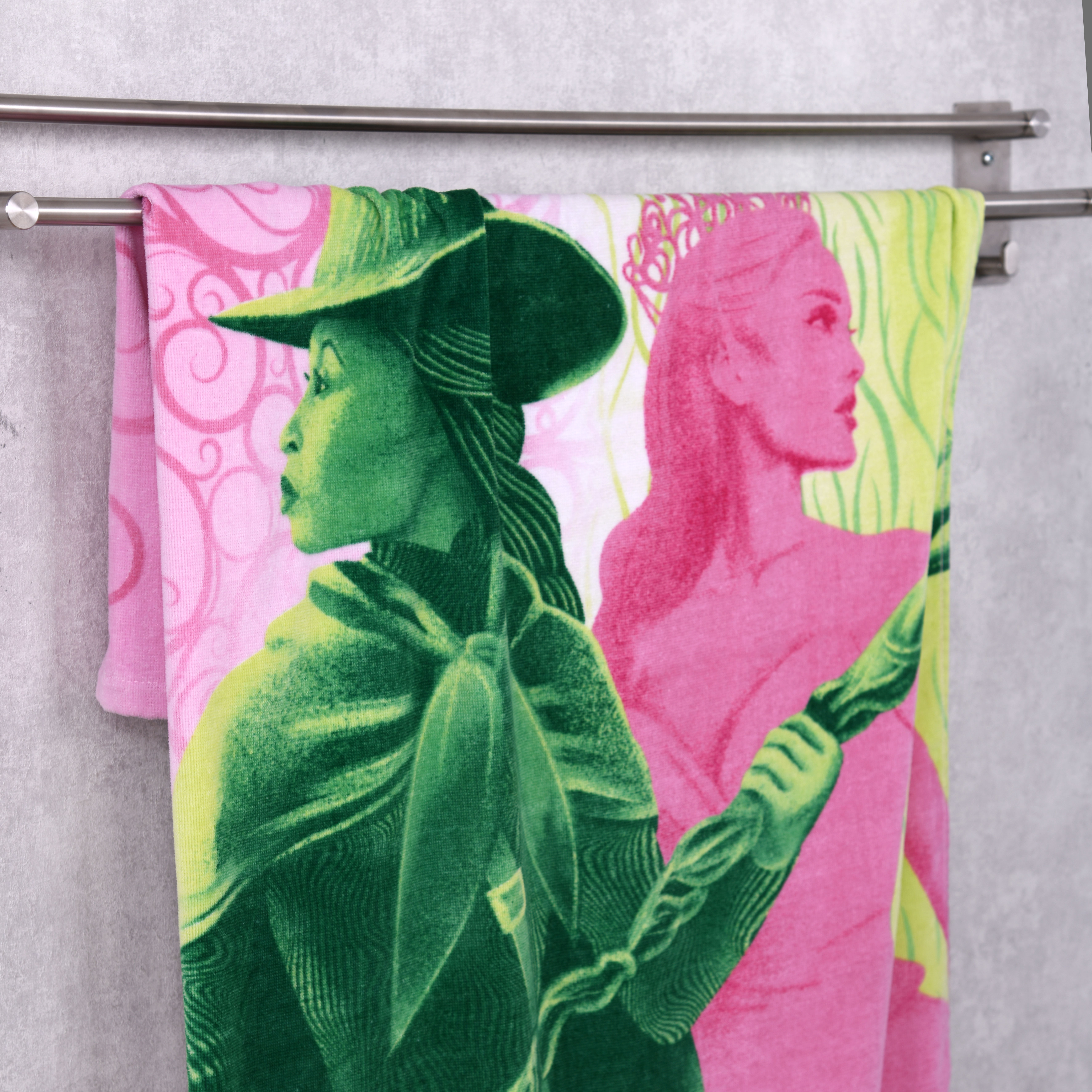 Erlebe die Magie von Wicked mit dem Wicked Handtuch – Mystic! Das Design zeigt die beiden Hauptcharaktere Elphaba und Glinda in Grün- und Rosatönen, umgeben von magischen Mustern. Das Wicked-Logo am unteren Rand rundet den Look perfekt ab.