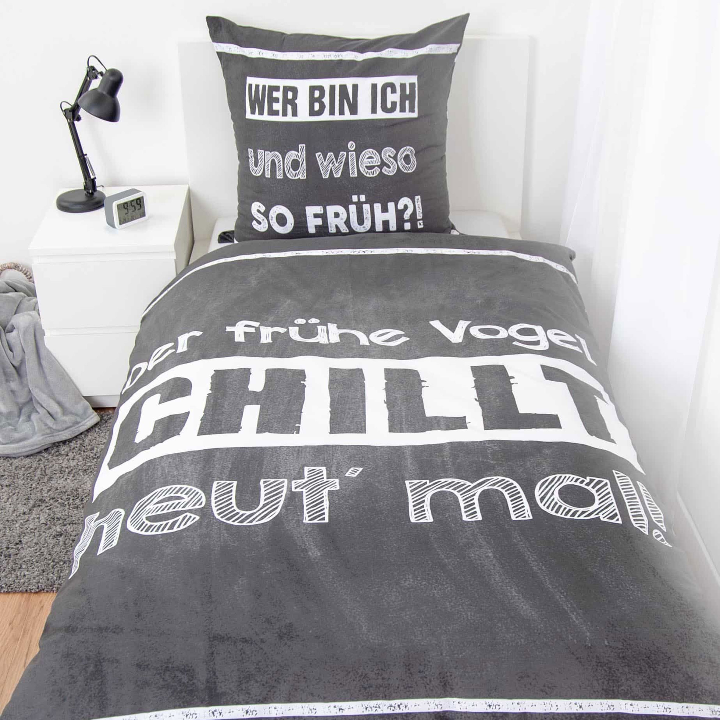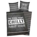Diese humorvolle Bettwäsche mit dem witzigen Spruch „Der frühe Vogel kann mich mal“ sorgt für entspannte Stimmung im Schlafzimmer.