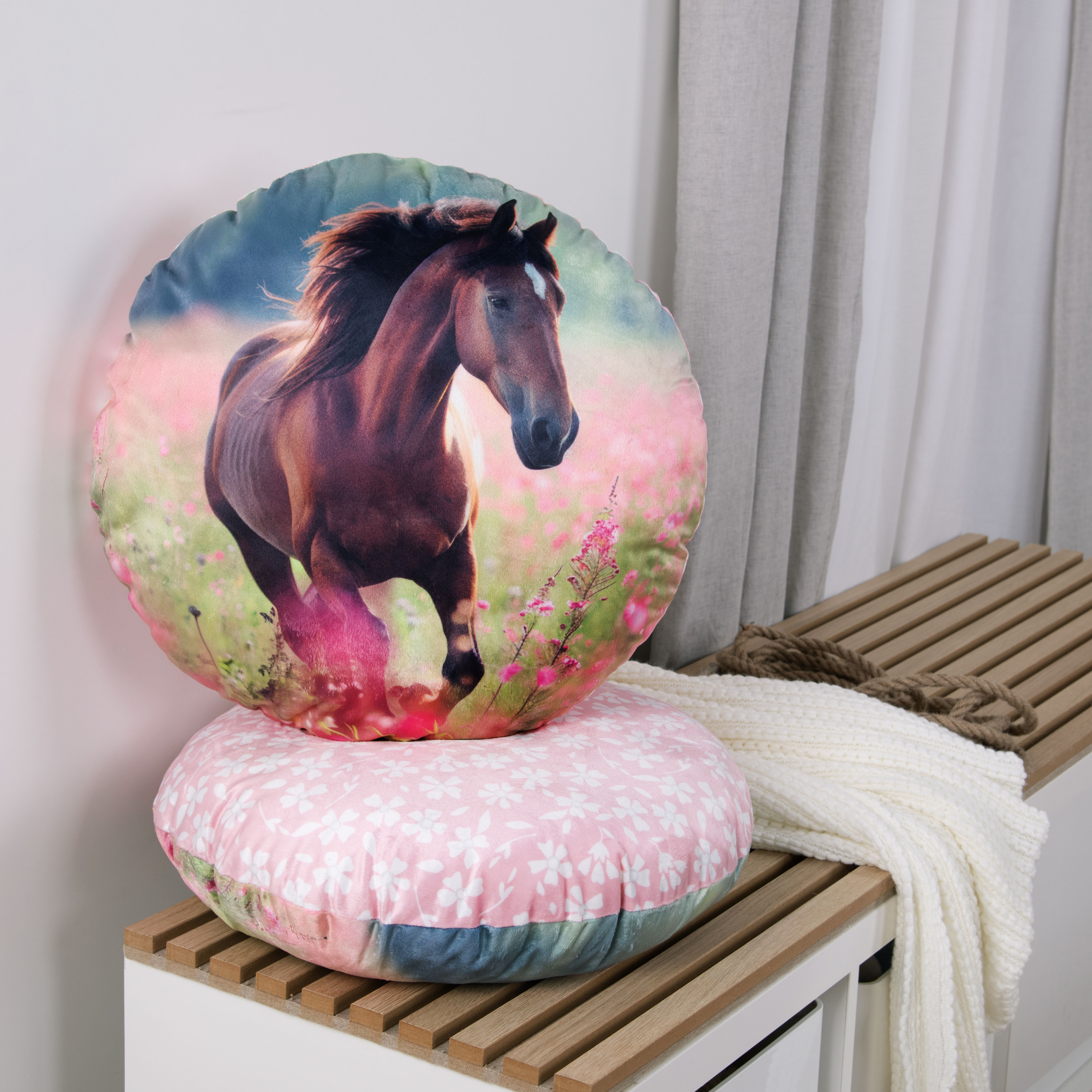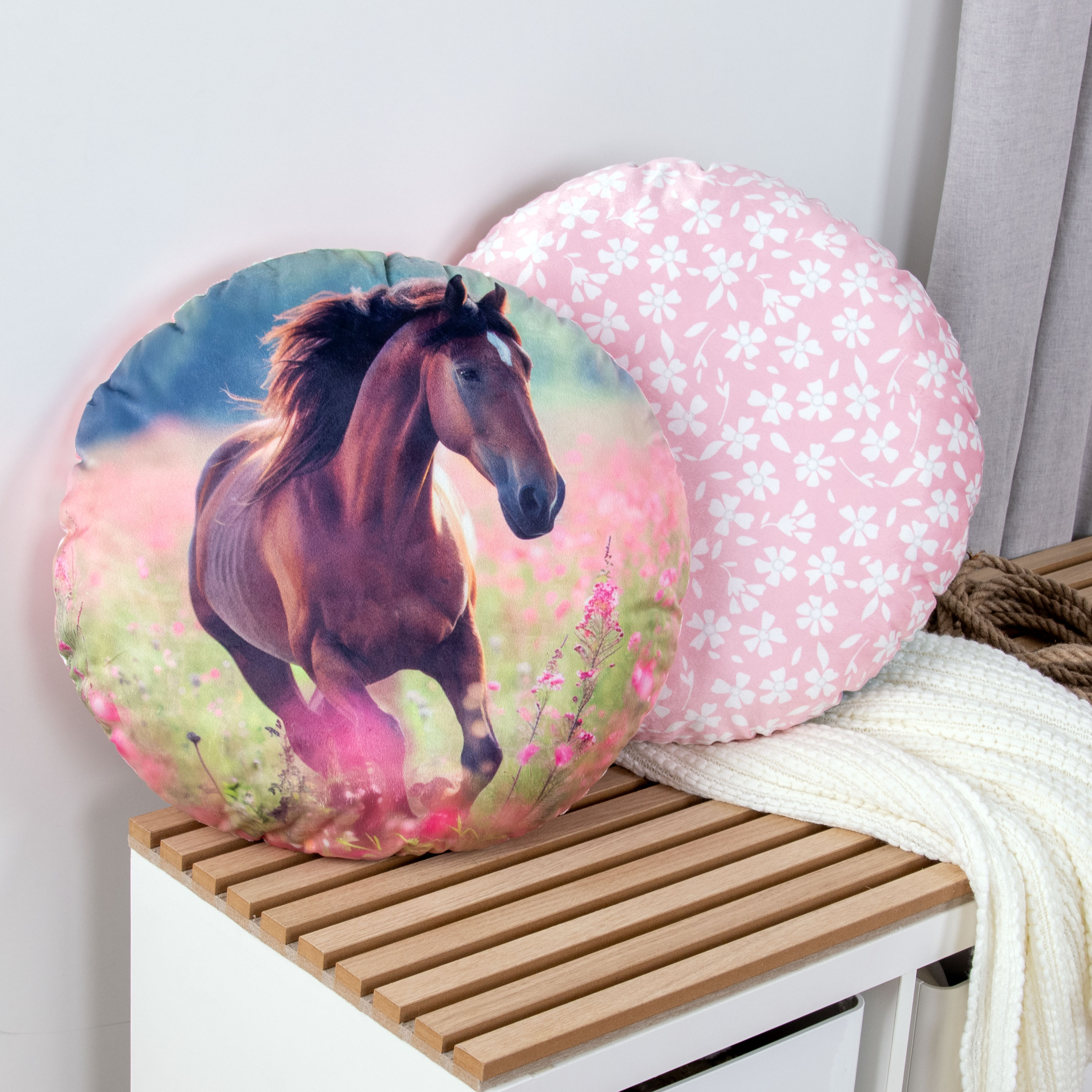Dieses runde Formkissen Pferdeglück der Young Collection ist ein Muss für alle Pferdefans. Auf der Vorderseite zeigt es ein wunderschönes Pferdemotiv in einer traumhaften Blumenwiese, während die Rückseite mit einem romantischen Blumen-Allover in Rosa bezaubert. Ein dekorativer Hingucker, der jedes Kinder- oder Jugendzimmer verschönert!
