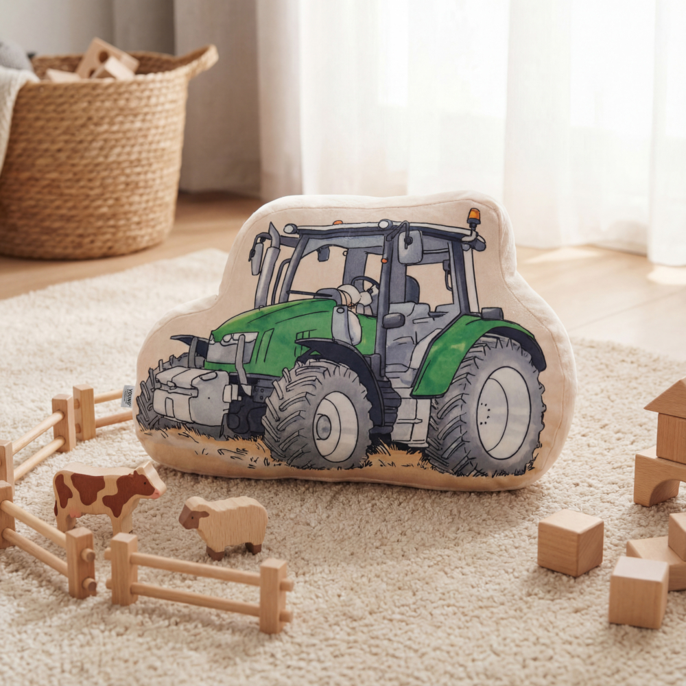 Dieses Formkissen mit Traktor-Motiv macht sich gut im Kinderzimmer und auf dem Sofa.